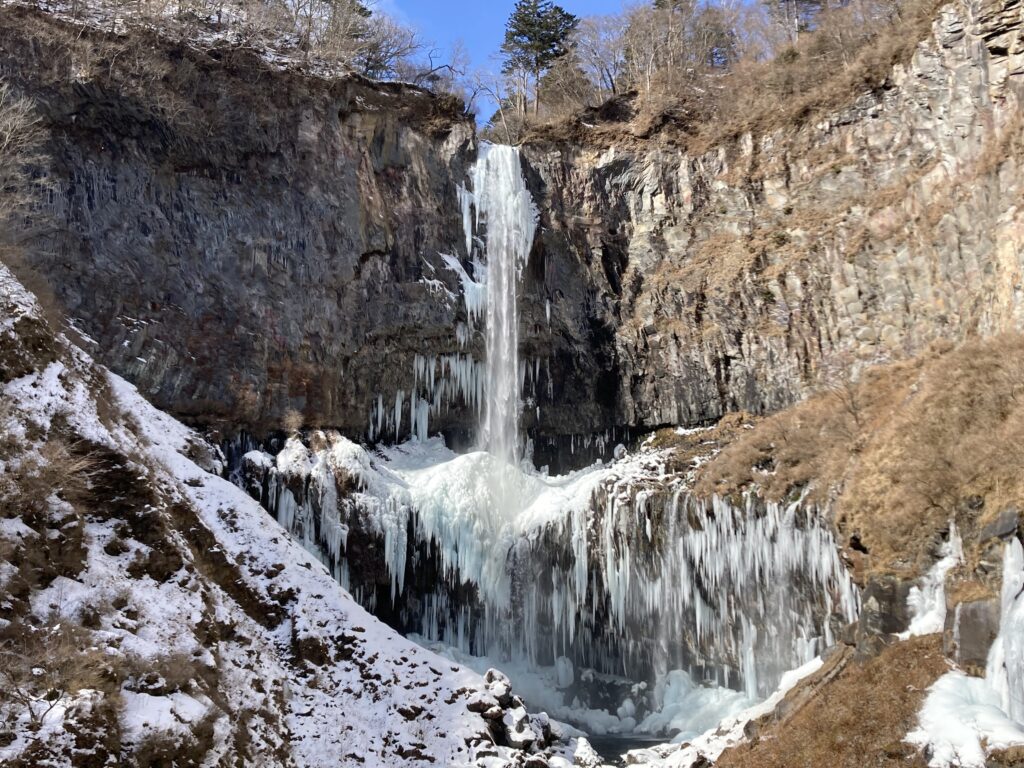 華厳滝では、水しぶきが凍り付き滝壺周辺に氷柱が出来ております。