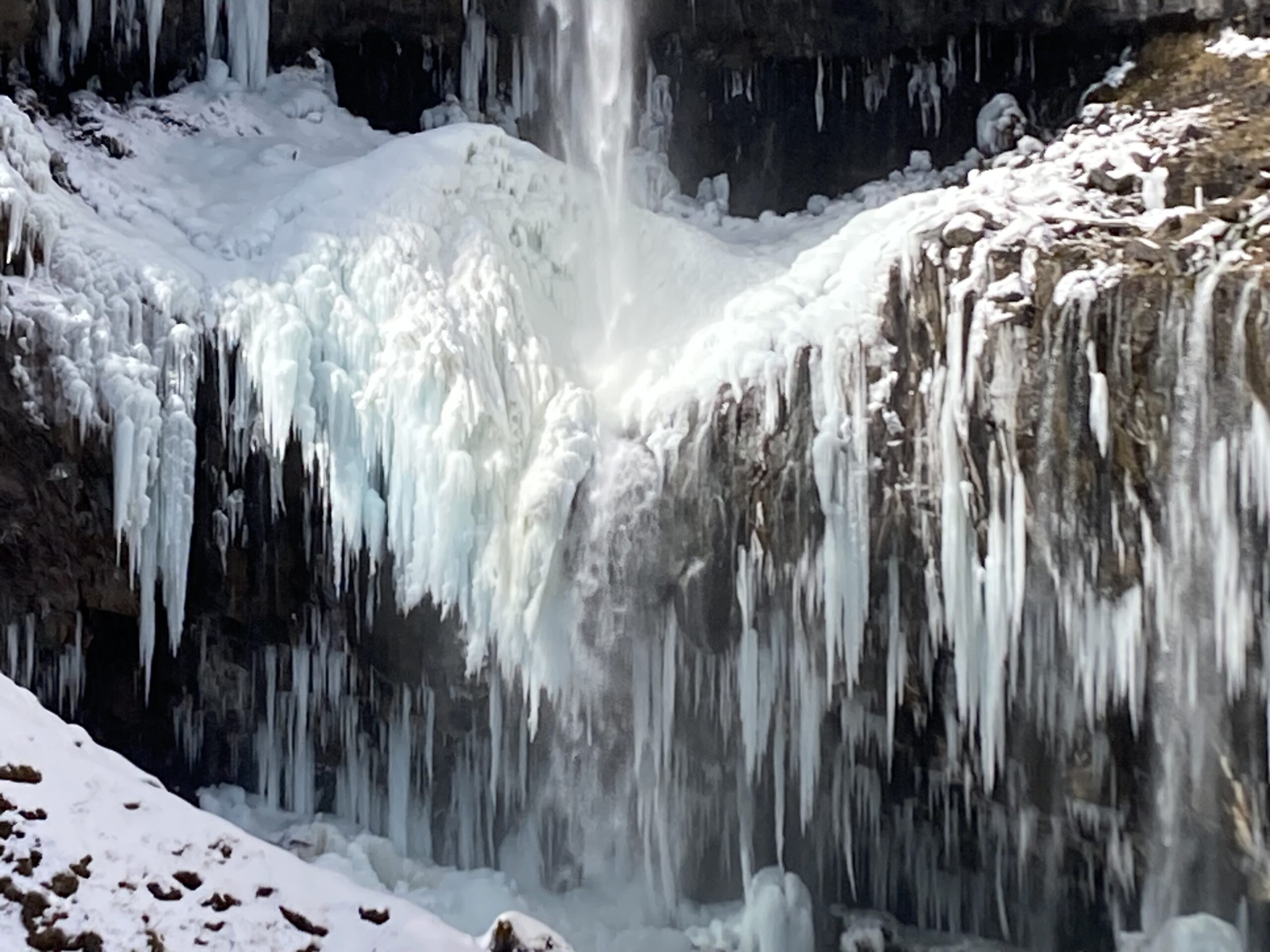 華厳滝では、水しぶきが凍り付き滝壺周辺に氷柱が出来ております。